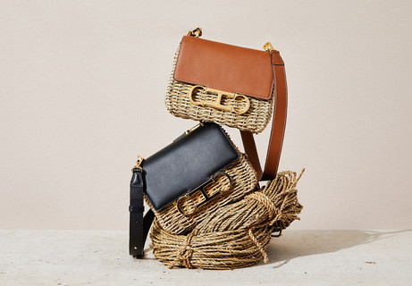 En Initials Insignia Bag, la rotación de las iniciales de Carolina, la C y la H, da lugar a un característico cierre metálico, que fusiona en esta nueva versión Seagrass, sus dos materiales al colocarse entre la solapa de piel y el cuerpo de alga trenzada.