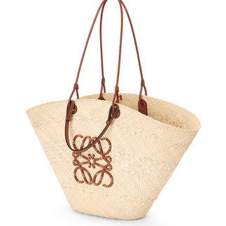 Te enamorarás de este bolso de cesta tradicional con un cuerpo clásico tejido a mano, correas de piel de becerro y un anagrama de piel de becerro bordado. Esta versión grande está elaborada en palma de iraca que se cultiva, cosecha y seca al sol en Colombia, donde luego es tejida por mujeres artesanas de la Corporación Oficio y Arte, una organización guiada por los principios del comercio justo.